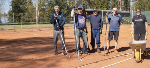 Talvi oli taas runnellut Tölvän tenniskenttää. Suurimman riesan aiheuttaa rikkaruohon kasvaminen. Tähän työhön panostettiin koko joukon voimalla. Tenniskenttä on kokonaisuudessaan n. 650 m2, joten on siinä kitkemistä. Kun 7 miestä ryhtyi toimeen, niin 4 tunnissa kenttä saatiin taas pelikuntoon.